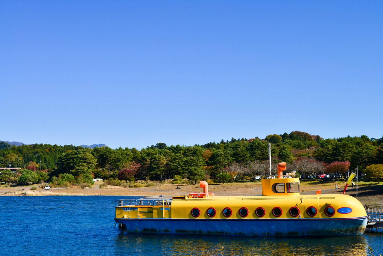潜水艦をモチーフにしたユニークな観光船。船内の窓からは、湖底の岩や魚たちの姿を間近に見られ、子どもから大人まで楽しめます。